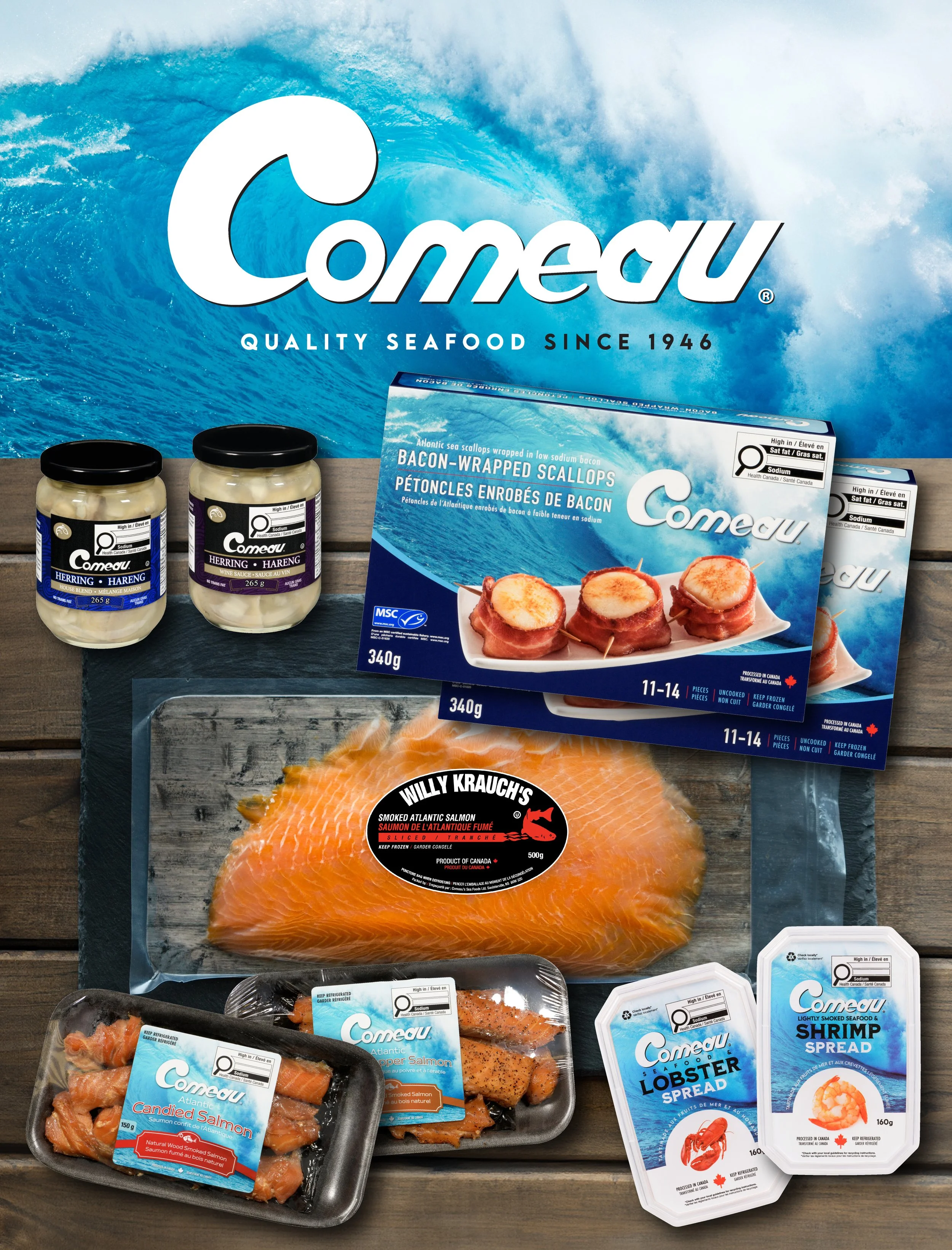 Faites-vous plaisir avec une sélection de fruits de mer inspirée des saveurs locales, gracieuseté de Comeau’s Sea Foods. Ce prix comprend : 2 paquets de pétoncles enrobés de bacon, 2 paquets de saumon fumé à froid, 1 paquet de lanières de saumon fumé à l’érable et au poivre, 1 paquet de lanières de saumon fumé confit, 1 tartinade de fruits de mer et homard, 1 tartinade de fruits de mer et crevettes, 1 hareng mariné (mélange maison) et 1 hareng mariné (sauce au vin).